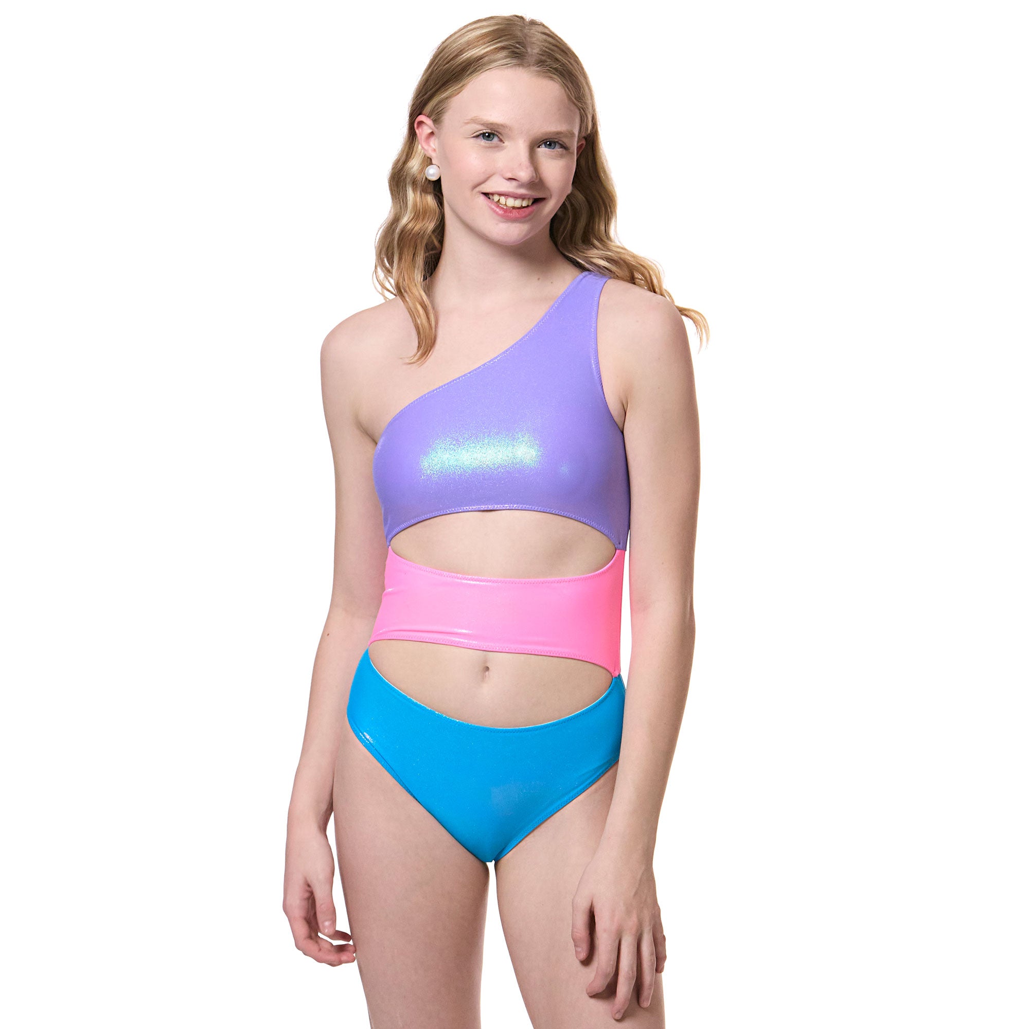 The St. Lucia One-Piece delivers statement-making style with a sleek one-shoulder neckline and double cutout waist. Designed in our Paradise Colorblock—a vibrant blend of lilac, hot pink, and aqua—this suit brings a shimmer-finish glow to every swim. Fully lined and built for durability, it’s equal parts fashion and function.