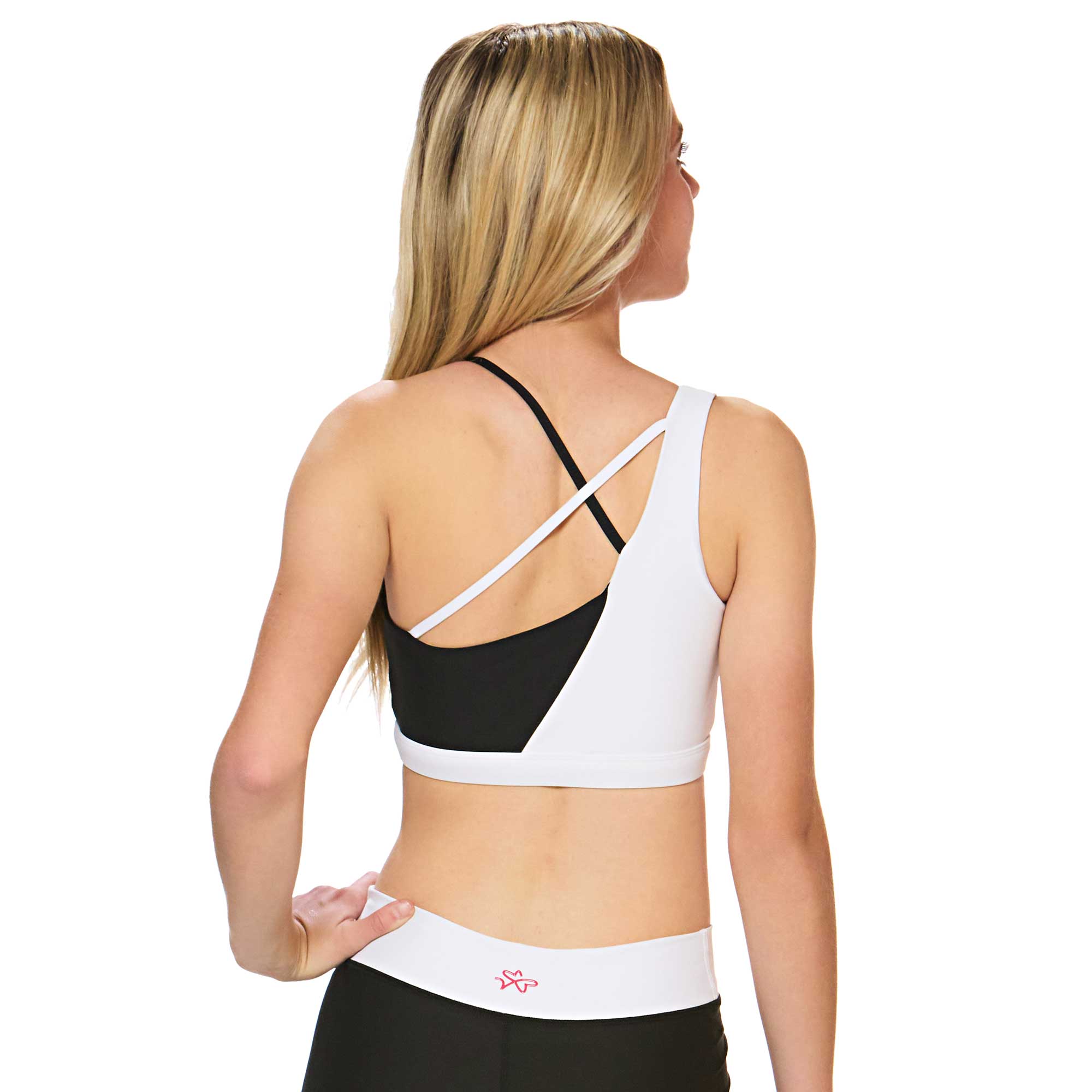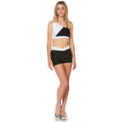 Stand out with the Ava Sports Bra, featuring a bold black-and-white color block design that makes a statement. This sports bra features an eye-catching, asymmetric front for a modern look and an edgy crisscross back design.